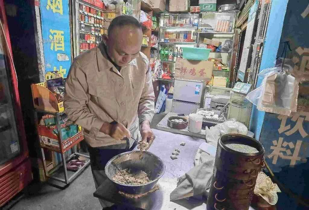 记者边走边看边聊,在韶关市浈江区启明市场北侧的一家小卖部+早餐的夫妻店看到,两夫妻分工明确,丈夫包饺子、小笼包,妻子准备调料食材,两人都忙得不亦乐乎,仿佛忘却了寒冷和时间!