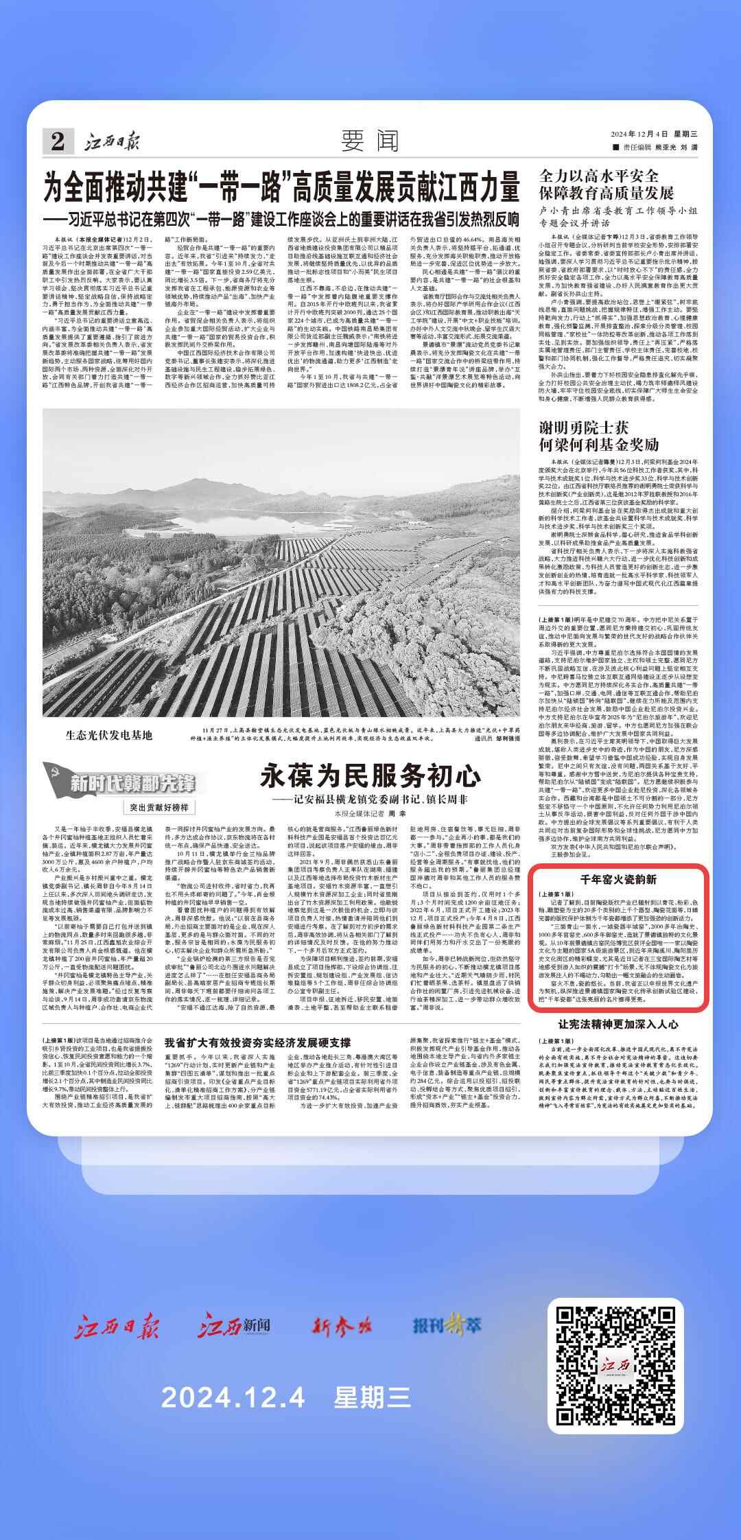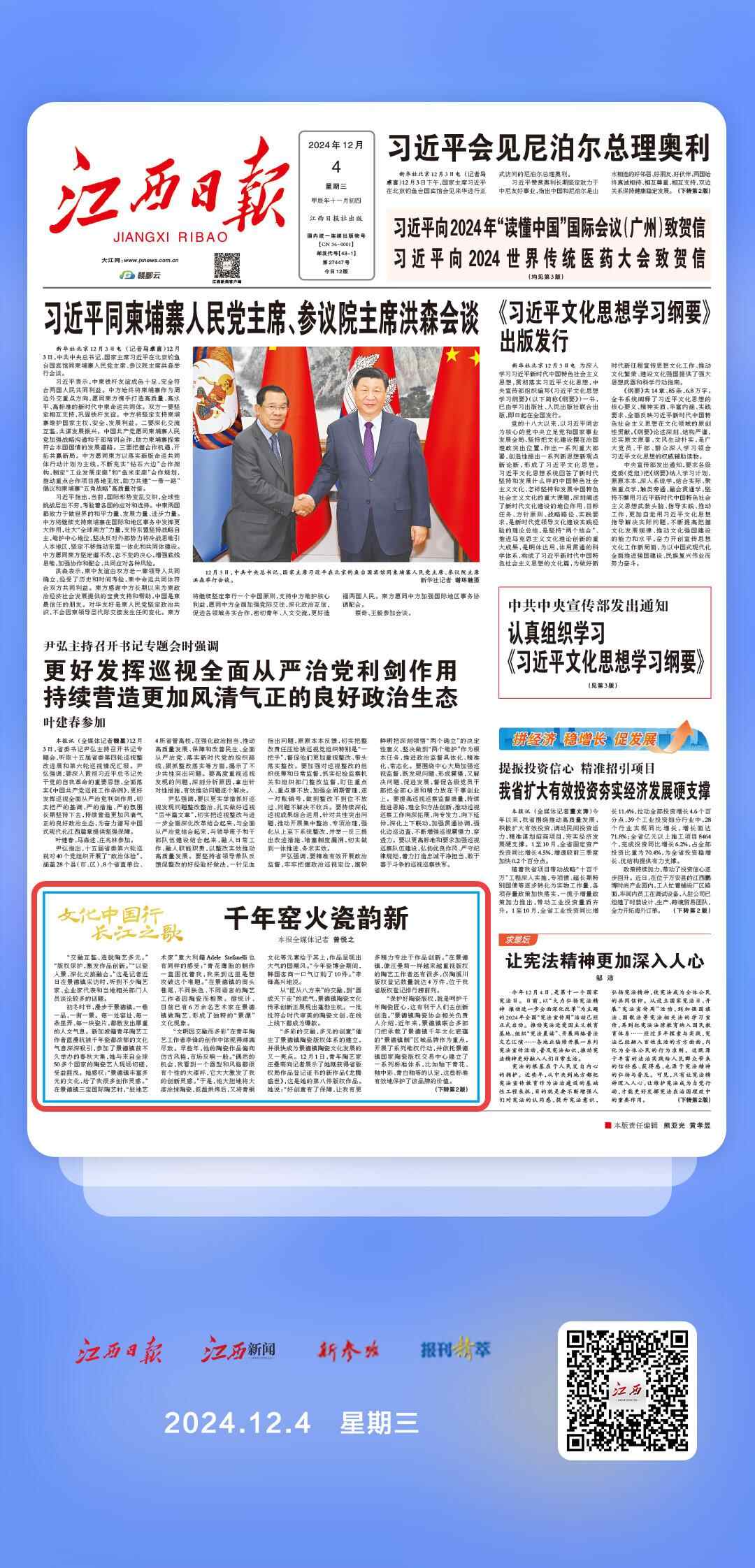 窑火不息,瓷韵悠长。当前,我省正以申报世界文化遗产为契机,纵深推进景德镇国家陶瓷文化传承创新试验区建设,把“千年瓷都”这张亮丽的名片擦得更亮。