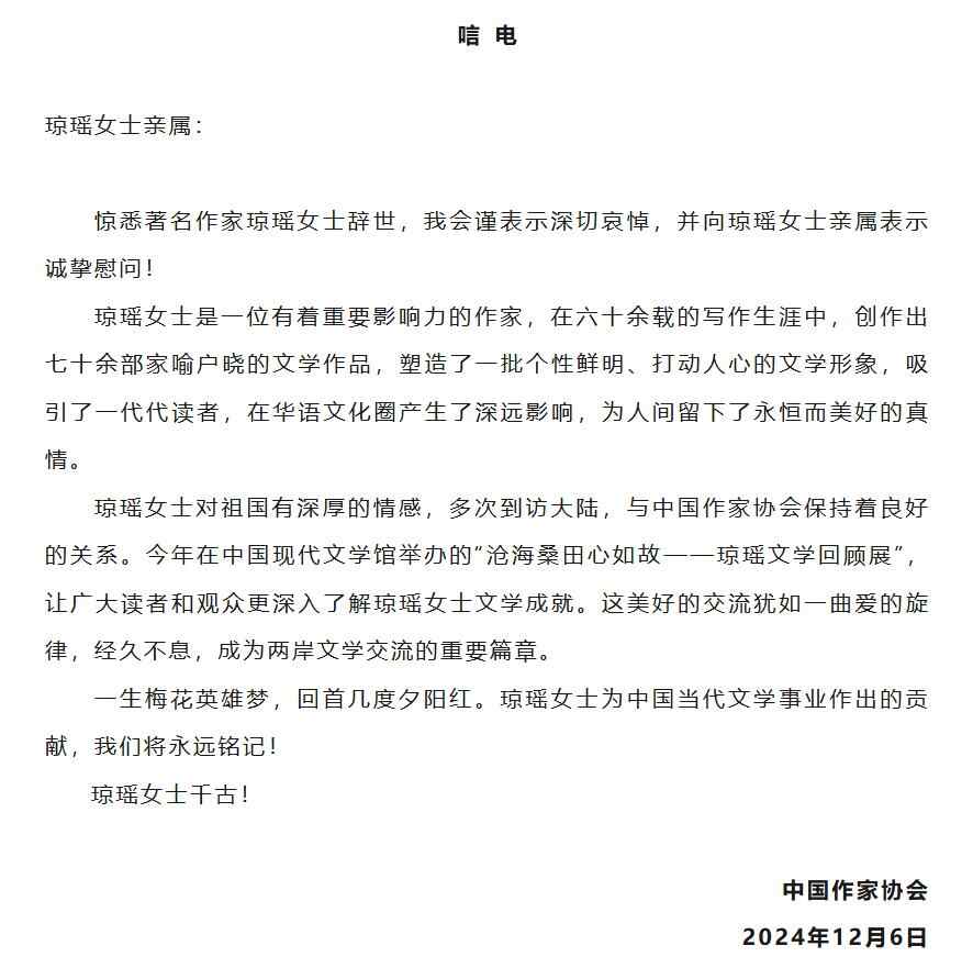 12月4日,台湾著名作家琼瑶在家中去世,终年86岁。6日,中国作家协会向琼瑶女士亲属致唁电,对琼瑶女士去世表示哀悼,并向其亲属表示慰问。