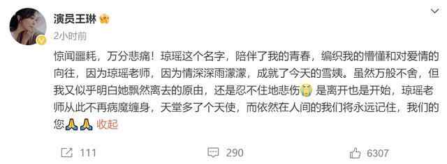 王琳在微博发文表示:惊闻噩耗,万分悲痛!琼瑶这个名字,陪伴了我的青春,编织我的懵懂和对爱情的向往,因为琼瑶老师,因为情深深雨濛濛,成就了今天的雪姨。虽然万般不舍,但我又似乎明白她飘然离去的原由,还是忍不住地悲伤。