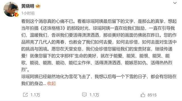 黄晓明发文称:看到这个消息真的心痛不已。看着琼瑶阿姨最后留下的文字,是那么的真挚,想起当年拍摄《还珠格格3》的那段时光,琼瑶阿姨一直在给我们鼓励,一直在引导我们,温暖我们,告诉我们要活得潇潇洒洒,那些美好的画面仿佛就在昨日。您的作品照亮了几代人的青春,也教会了我们如何去爱,如何去珍惜,如何去面对生活中的挑战与困境。愿您在天堂安息,我们会珍惜您留给我们的宝贵财富,继续传递爱!就像您留下的文字那样“生命的美好,就在于能爱、能笑、能恨、能哭、能歌、能说、能跑、能动、能红尘作伴、活得潇潇洒洒,能嫉恶如仇、活得热热烈烈”。