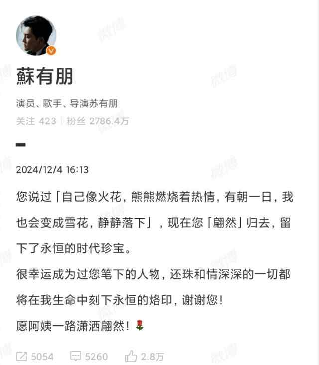 苏有朋微博发文称:您说过「自己像火花,熊熊燃烧着热情,有朝一日,我也会变成雪花,静静落下」 ,现在您「翩然」归去,留下了永恒的时代珍宝。