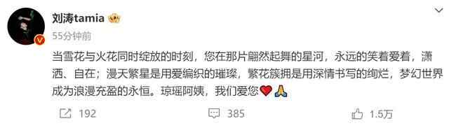 刘涛发文表示:当雪花与火花同时绽放的时刻,您在那片翩然起舞的星河,永远的笑着爱着,潇洒、自在;漫天繁星是用爱编织的璀璨,繁花簇拥是用深情书写的绚烂,梦幻世界成为浪漫充盈的永恒。琼瑶阿姨,我们爱您。