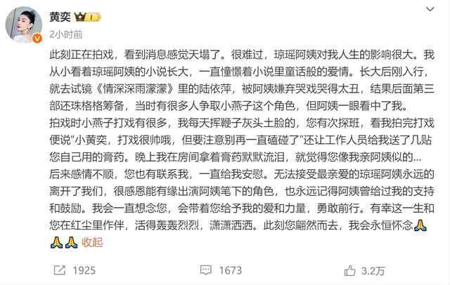 演员黄奕发文悼念,她回忆《情深深雨濛濛》《还珠格格》的试镜经历和拍摄过程时说,刚入行就去试镜《情深深雨濛濛》里的陆依萍,被阿姨嫌弃哭戏哭得太丑,结果后面第三部《还珠格格》筹备,阿姨一眼看中了她,后来感情不顺,琼瑶也联系她一直给她安慰,“很感恩能有缘出演阿姨笔下的角色,也永远记得阿姨曾给过我的支持和鼓励。我会一直想念您,会带着您给予我的爱和力量,勇敢前行。”
