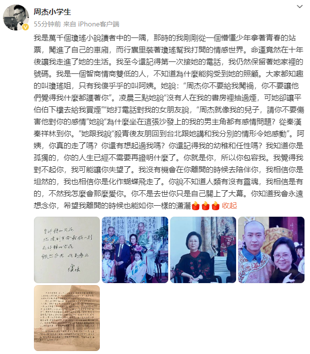 我是万千个琼瑶小说读者中的一隅,那时的我刚刚从一个懵懂少年拿着青春的站票,闯进了自己的车厢,而行囊里装着琼瑶帮我打开的情感世界。命运竟然在十年后让我走进了她的生活。我至今还记得第一次接她的电话,我仍然保留着她家里的号码。我是一个智商情商双低的人,不知道为什么能够受到她的照顾。大家都知趣的叫琼瑶姐,只有我傻乎乎的叫阿姨。她说:“周杰你不要给我闯祸,你不要让他们觉得我什么都护著你”。凌晨三点她说“没有人在我的书房里抽过烟,可她却让平伯伯下楼去给我买烟”“她打电话对我的女朋友说,“周杰就像我的儿子,请你不要伤害他对你的感情”她说“为什么坐在这张沙发上的我的男主角都有感情问题?从秦汉秦祥林到你。”她跟我说“杀青后友朋回到台北跟她讲和我分别的情形令她感动”。阿姨,你真的走了吗?你还有想起过我吗?你还记得我的幼稚和任性吗?我知道你是孤独的,你的人生已经不需要再证明什么了。你就是你,所以你包容我。我觉得我对不起你,我可能让你失望了。我没有机会在你离开的时候去陪伴你,我相信你是坦然的,我也相信你是化作蝴蝶飞走了。你说不知道人类有没有灵魂,我相信是有的,不然我怎么会那么爱你。你不是去世你只是自己关上了大幕。你知道我会永远想念你,希望我离开的时候也能如你一样的潇洒。