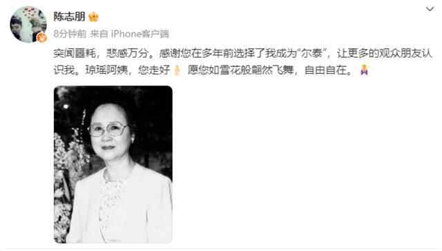 陈志朋微博发文表示:突闻噩耗,悲感万分。感谢您在多年前选择了我成为“尔泰”,让更多的观众朋友认识我。琼瑶阿姨,您走好。愿您如雪花般翩然飞舞,自由自在。