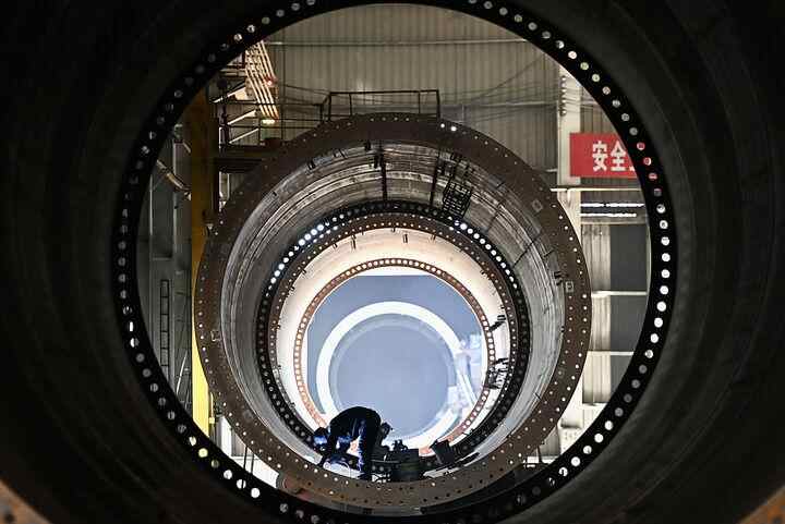 2024年4月23日,新疆木垒哈萨克自治县民生工业园区木垒泰胜风能装备有限公司工人在生产线上生产风力发电机塔筒。新华社记者 王菲 摄