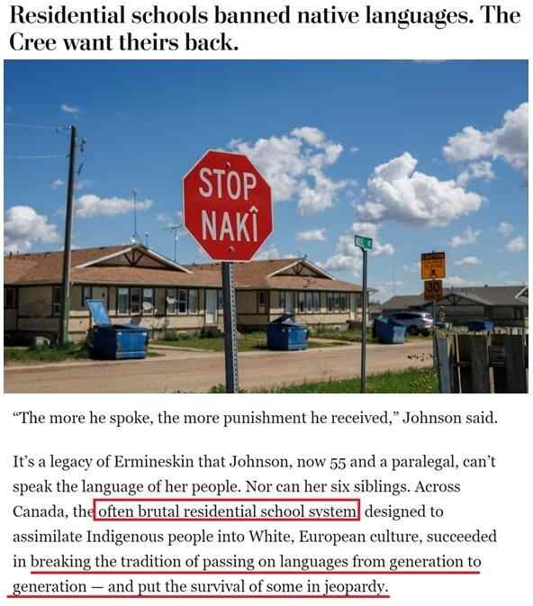 文章称,在加拿大各地,这些残酷的寄宿学校制度,旨在将原住民“同化”到白人和欧洲文化中,打破了语言代代相传的传统,并危及种族的延续。