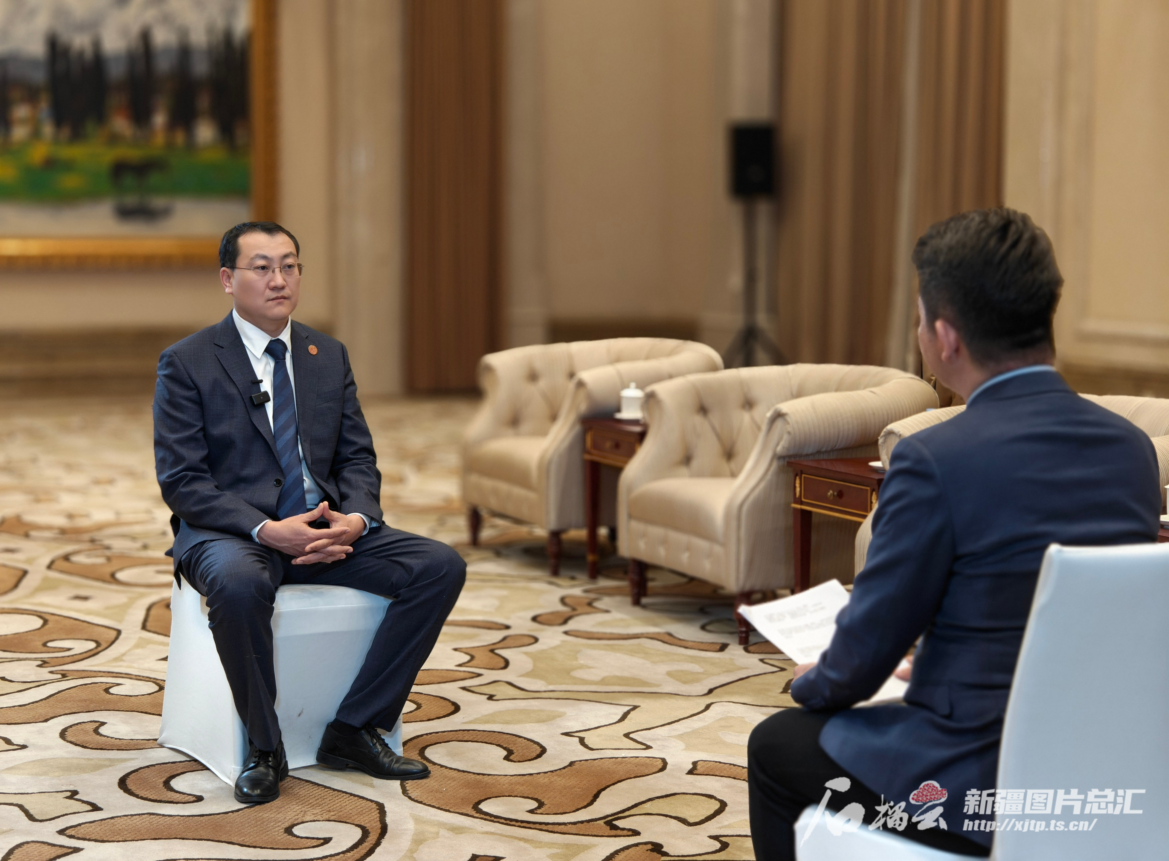 哈萨克斯坦贸易和一体化部副部长凯拉特·托列巴耶夫(左)接受中国新疆媒体记者专访。天山网-新疆日报记者 范琼燕摄