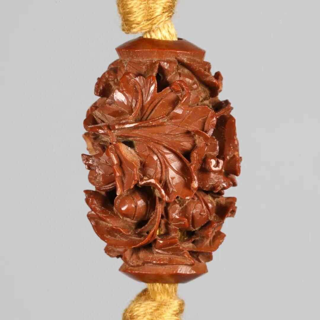 清末,由于战事频繁,核雕业一度凋敝,精美的官造核雕逐渐销声匿迹。幸运的是,核雕工艺在民间仍然受到一定程度的关注和喜爱。民国初年,民间涌现出一批擅雕能刻的核雕高手,如山东的都兰桂及其徒弟考功卿,苏州舟山的殷根福及其子女徒弟等,他们是中国核雕承上启下的名家,为中国核雕工艺的繁荣和发展做出了重要贡献。这一时期的核雕艺人在继承前人技艺的基础上,不断进行创新和探索。以罗汉为题材的念珠形式开始由殷根福发扬光大。