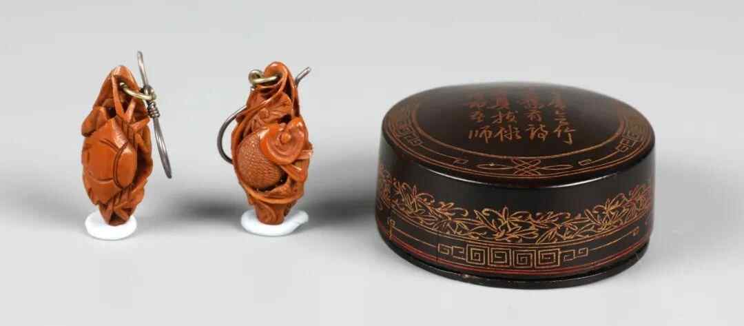“鱼戏荷叶 八方来财”耳环带漆盒,清晚期,高3.1厘米,直径1.4厘米,总重3.5克;盒直径4.9厘米,高2.6厘米,重18.7克