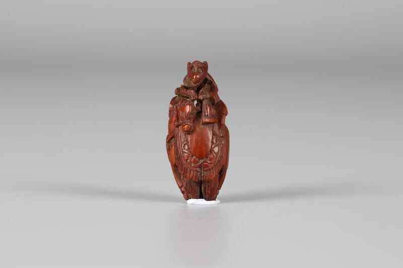 《马上封侯》是明清工艺品中的常见题材,巧妙运用“猴”与“侯”谐音,寓意功名立至,即刻封侯。猴子手执官印,象征权力与地位;莲蓬象征家庭和睦,幸福美满;马鞍上浅刻兰花,预示清雅与高洁。整体造型设计感极强,蕴含着对佩戴者的美好祝愿,是“马上封侯”类核雕文物中的珍品。