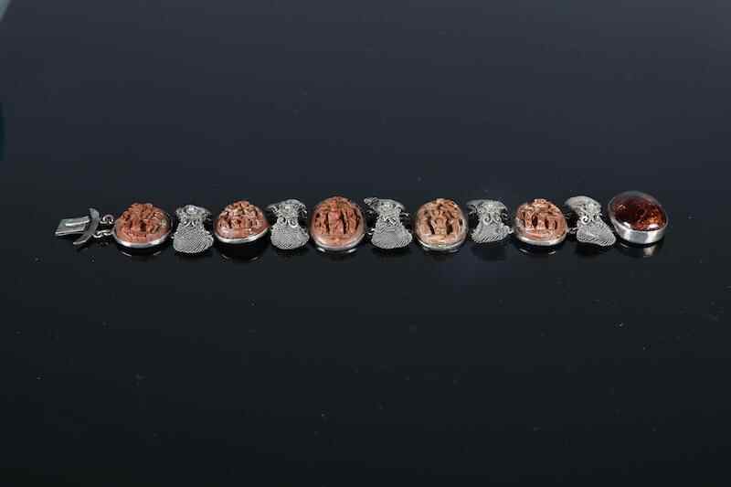 金银器手链是广作外销金银器的一个品种,金银往往镶嵌各种珍贵材质的雕刻作品,如象牙、榄核、珊瑚、宝石等。这件“清银累丝花卉纹镶核雕戏文故事手链”,长19.9厘米,宽2.3厘米,采用银累丝制成,一端镶嵌有宝石,间隔5个椭圆形托,托内镶嵌核雕戏文故事。作品雕刻精细,制作精美,色彩雅致,造型美观。
