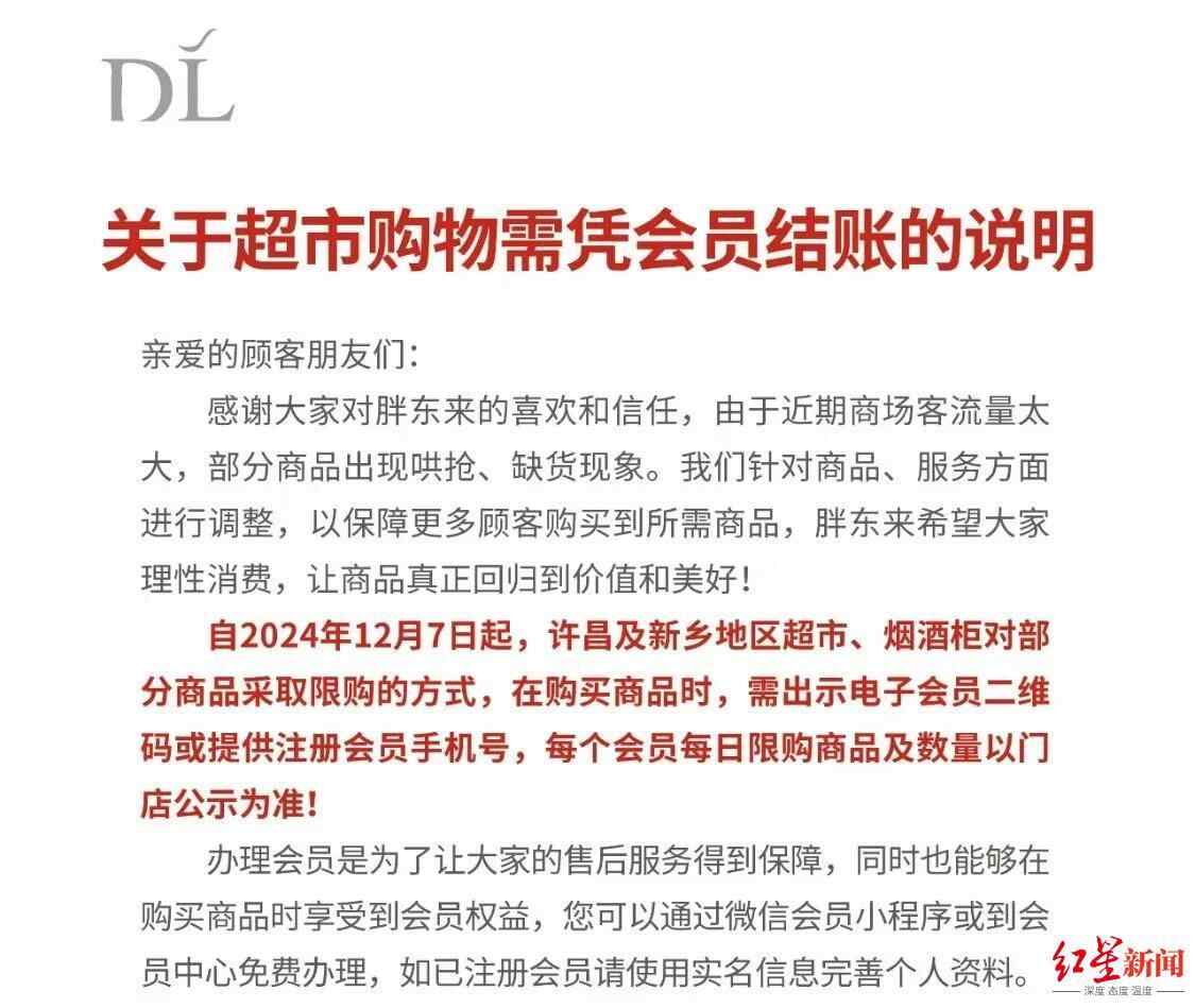 胖东来方面表示,自12月7日起,河南许昌及新乡地区超市、烟酒柜对部分商品采取限购的方式,在购买商品时,需出示电子会员二维码或提供注册会员手机号,每个会员每日限购商品及数量以门店公示为准。办理会员是为了让大家的售后服务得到保障,同时也能够在购买商品时享受到会员权益。