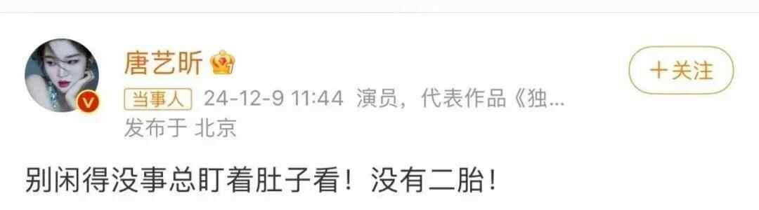 对此,当事人唐艺昕火速回应。她干脆利落地否认:“没有二胎”“别闲得没事总盯着肚子看”。