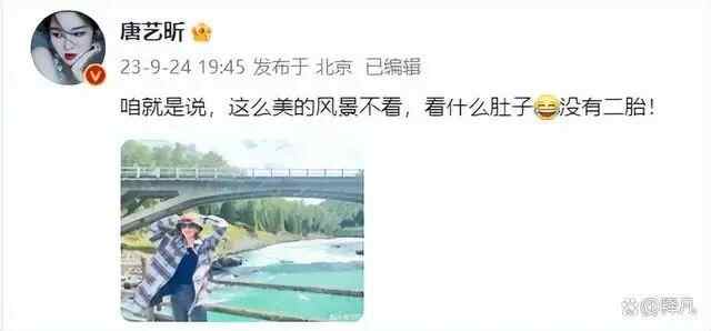 传闻刚出来没多久,唐艺昕第一时间发文否认,“咱就是说,这么美的风景不看,看什么肚子,没有二胎”。