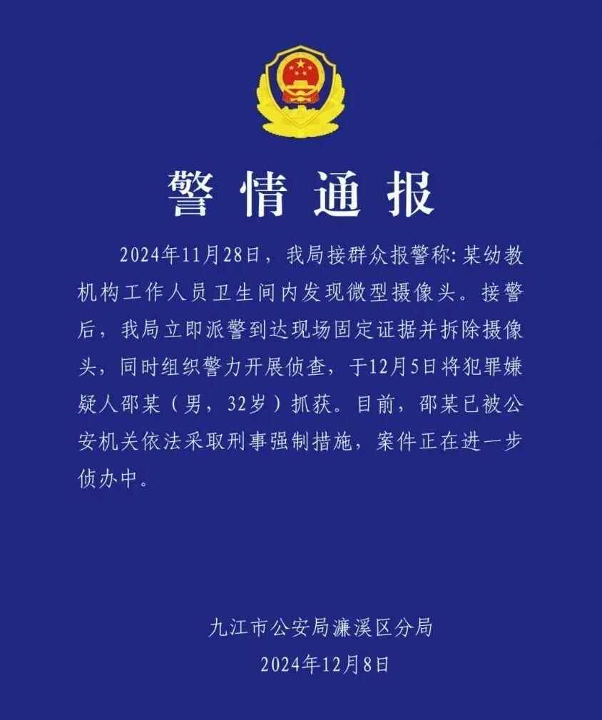 2024年11月28日,我局接群众报警称:某幼教机构工作人员卫生间内发现微型摄像头。接警后,我局立即派警到达现场固定证据并拆除摄像头,同时组织警力开展侦查,于12月5日将犯罪嫌疑人邵某(男,32岁)抓获。目前,邵某已被公安机关依法采取刑事强制措施,案件正在进一步侦办中。