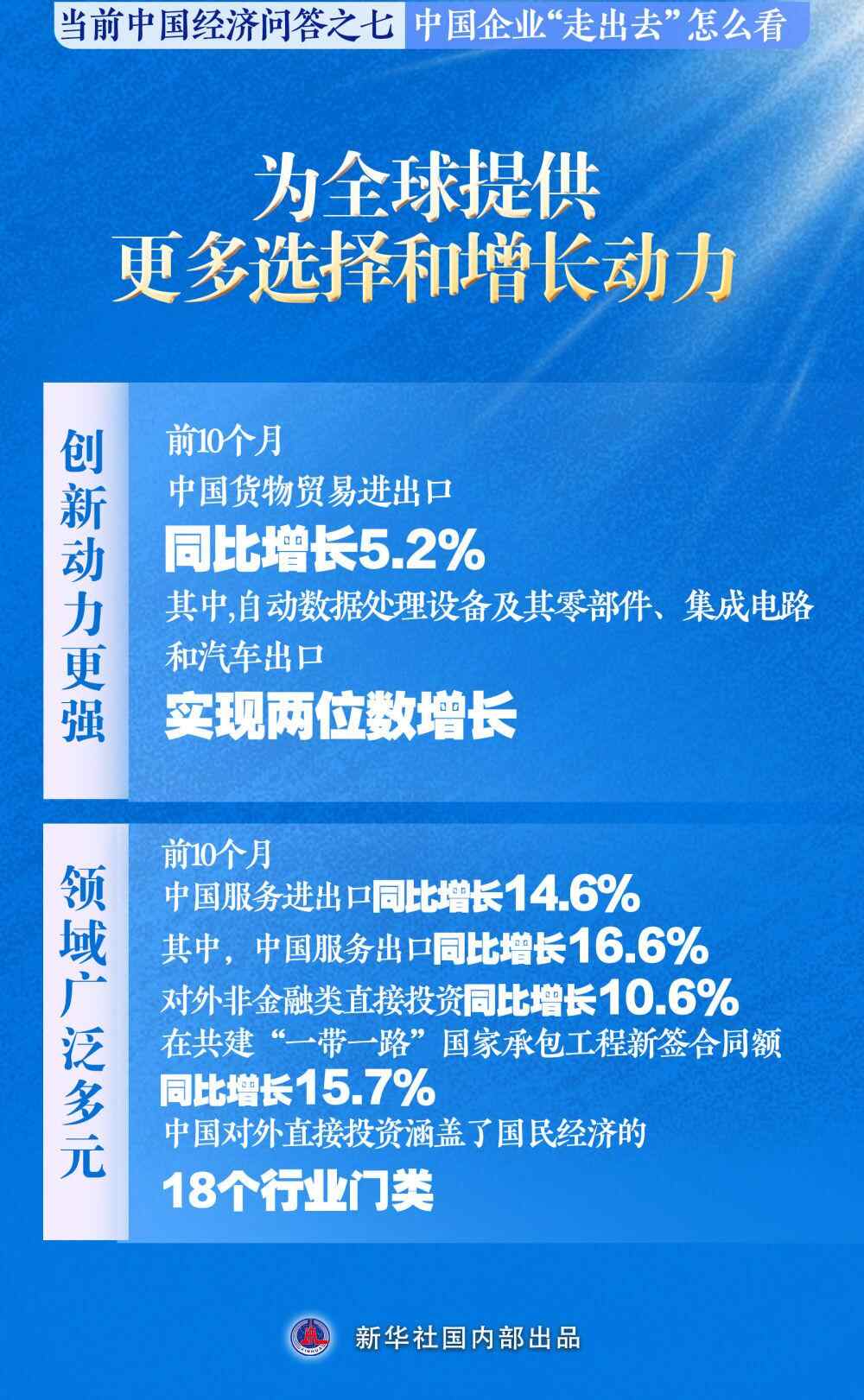 从持续举办进博会、服贸会、广交会,到积极参与联合国、世界贸易组织、二十国集团、亚太经合组织、上海合作组织等多边机制合作,再到推动高质量共建“一带一路”、积极参与应对气候变化全球治理……一系列举措为中国企业“走出去”开辟新空间,也为世界经济注入新动能。