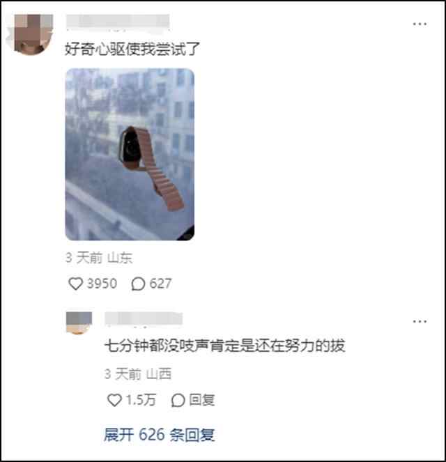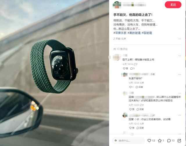 帖子火了之后,“不信邪”的网友们当真了,纷纷都在效仿这一行为,让自己的苹果手表贴高铁玻璃,事实证明发现,手表牢牢吸在玻璃上,真的取不下来了……