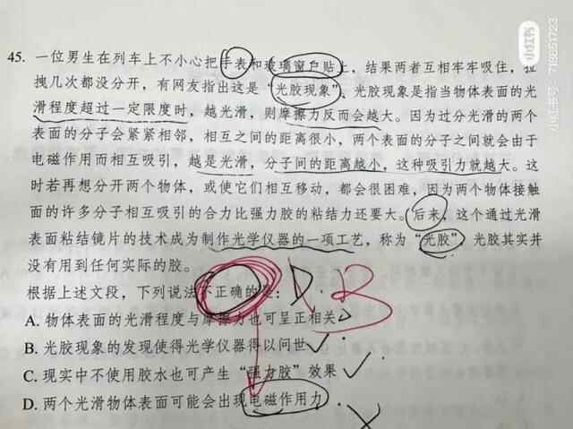 也有网友放了一道物理题解答,解释“光胶现象”,指的是当物体表面的光滑程度超过一定限度时,越光滑,分子间的距离越小,分子之间由于电磁作用相互吸引的吸引力就越大。