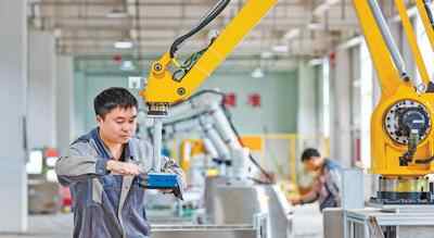 河南省安阳市一家机器人生产企业,工人为可移动工业机器人安装设备。