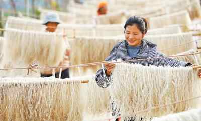 安徽省淮北市濉溪县蒙村村民在晾晒红薯粉丝。蒙村发展红薯种植产业实现增收。
