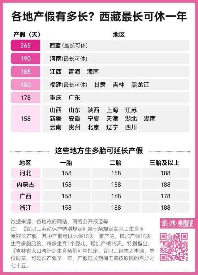 不过,多个省份在此基础上延长了产假。如在西藏,产假最长可休一年;广东则有178天产假;在北京、上海、新疆和云南等17地的产假天数为158天,各地产假天数最大相距207天。