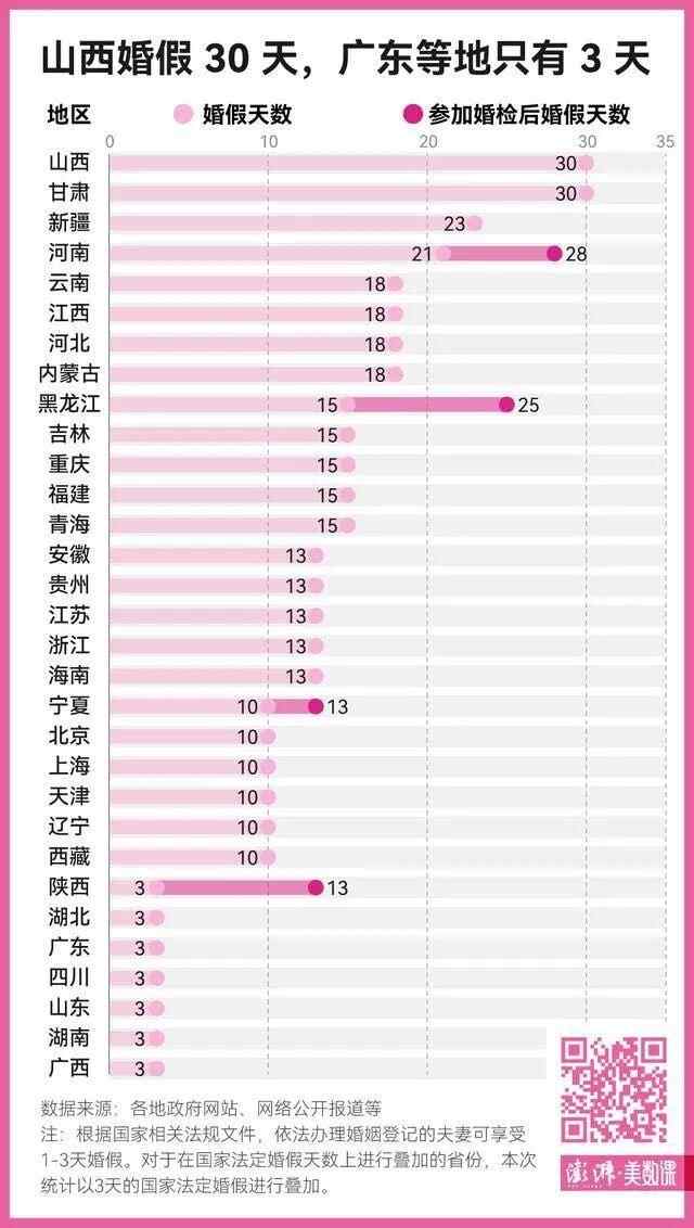 全国范围内,山西和甘肃婚假30天为全国最长,河南和黑龙江也分别达到了28天、25天。广东目前仍执行3天的婚假。