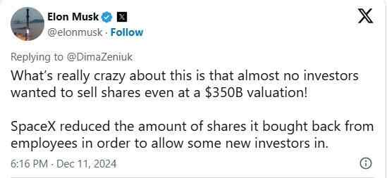 马斯克在社交媒体上回复有关SpaceX股票出售的帖子时写道,在3500亿美元的新估值下,几乎没有投资者愿意出售股票。“SpaceX减少了从员工手中回购的股票数量,以允许一些新投资者进入。”