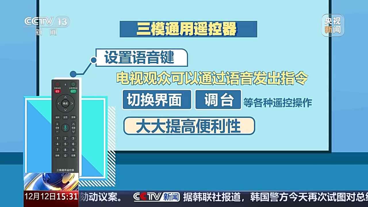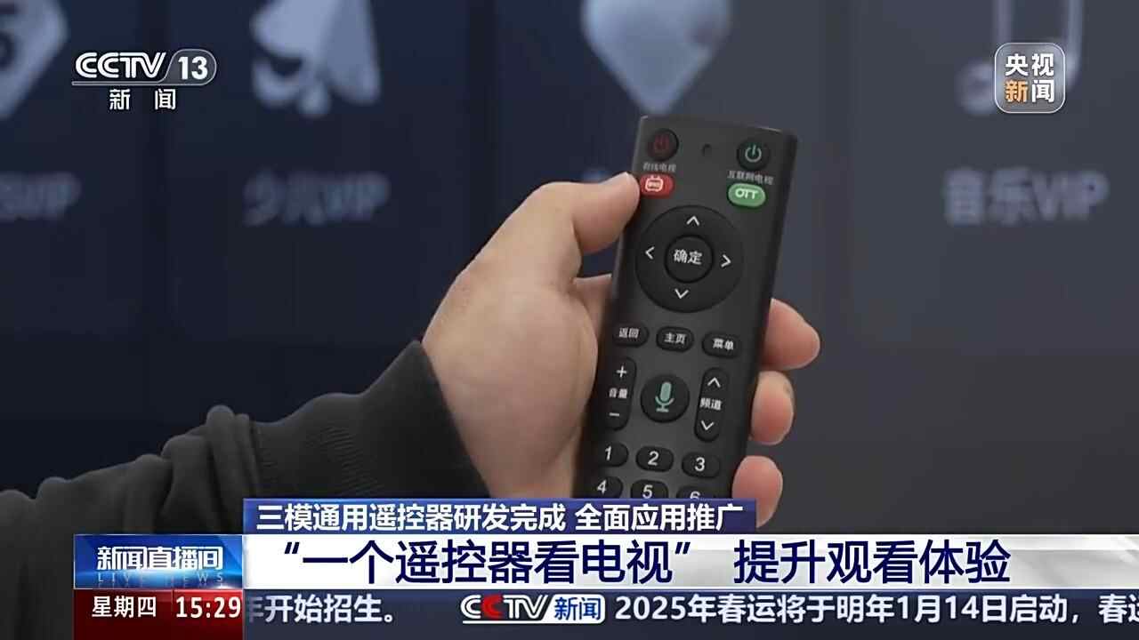 广电总局广播电视规划院无线所副所长 常江:其实大家一直就有一个痛点嘛,家里至少要控制一个机顶盒和电视,两个遥控器才能看电视,尤其是一些老年人,其实早就分不清到底该用哪个遥控器。那这次我们的三模通用遥控器,就是彻底真正意义上解决一个遥控器看电视,帮助我们老百姓真正能够提升操控体验,简单轻松地看电视。