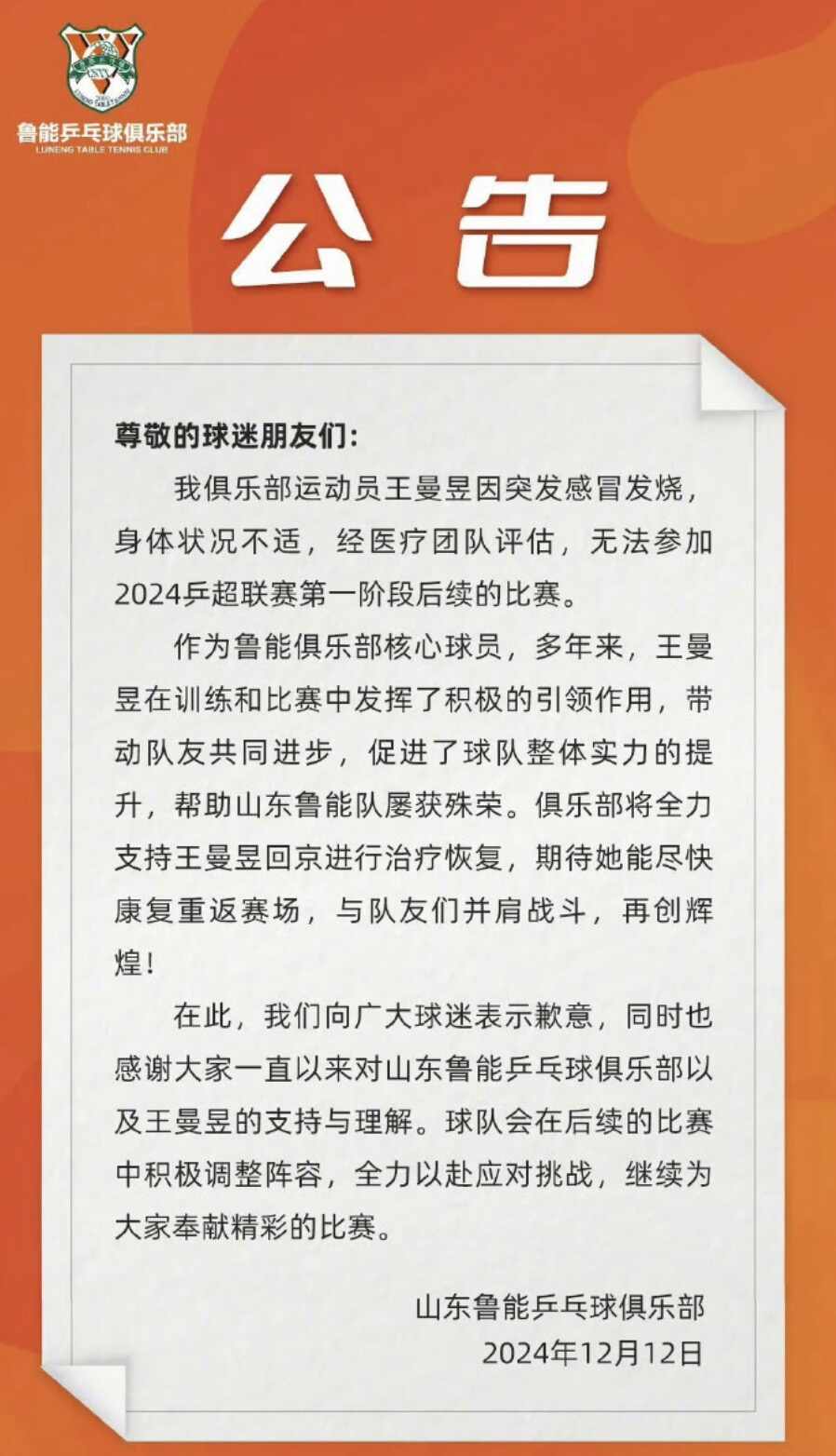 据 “山东鲁能乒乓球俱乐部”官方微信消息,王曼昱因突发感冒发烧身体状况不适,经医疗团队评估,无法参加2024乒超联赛第一阶段后续的比赛。