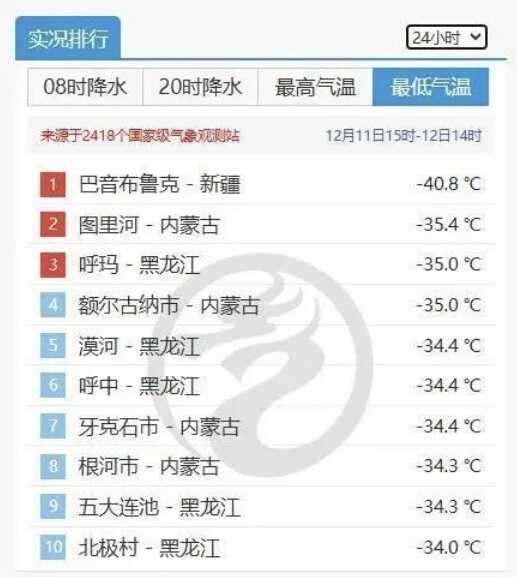前一日,据中央气象台最低气温实况排行显示,12月11日15时至12日14时,巴音布鲁克最低气温达-40.8℃,成为这一时间段全国最低气温排行榜榜首,比位列第二的内蒙古图里河低了5.4℃,也成为入冬后我国首个跌破-40℃的国家气象站。