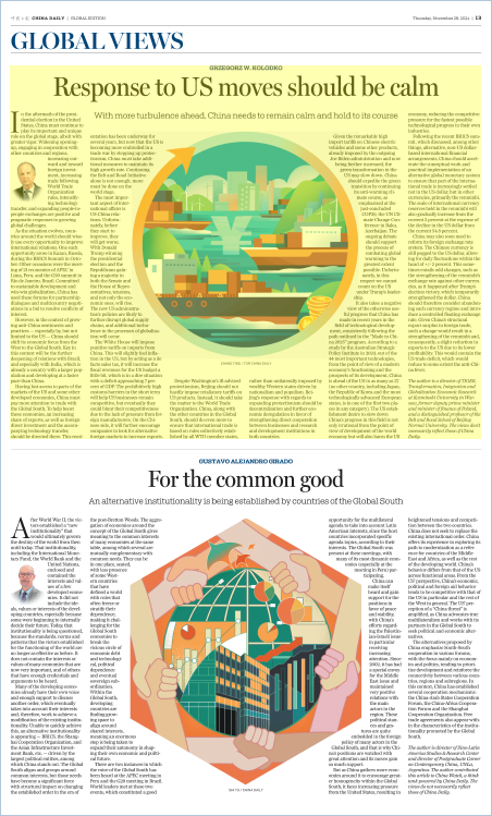 在美国总统大选已经尘埃落定后,中国不仅必须要继续在全球舞台上发挥其重要而独特的作用,而且要更加积极。扩大对外开放,开展对外合作,增加对外和对内投资,在世贸组织规则框架下扩大贸易,加强技术转让,促进人文交流……这些都是应对日益增多的全球性挑战的务实之举。