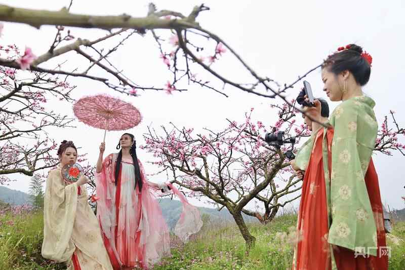 游客穿着汉服在永安市上坪乡的桃花林里拍照留影(央广网发 永安市融媒体中心供图)