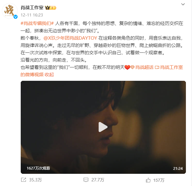 据肖战工作室,12月11日,肖战新专辑《我们》上线。