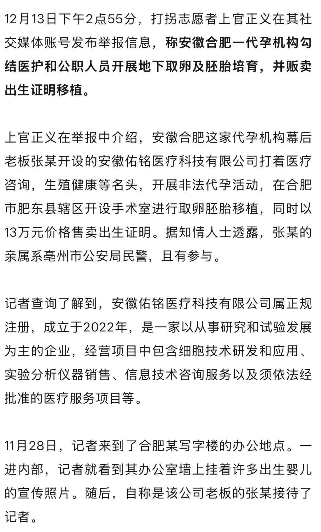 12月13日,肥东县新闻办发布情况通报:网传安徽佑铭医疗科技有限公司来我县从事代孕一事,县卫健委立即会同公安、市场监管等部门现场调查核实相关情况,依法查扣有关设备器具,并传唤该公司负责人。一经查实,将依法依规严肃处理。
