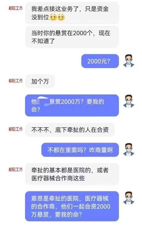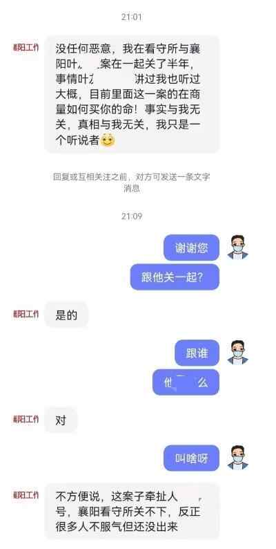 根据上官正义提供的与该网友的私信聊天截图显示,该网友自称曾在看守所中与叶某的亲属一起关押了半年,亲耳听闻襄阳贩婴案牵扯到的多名医院负责人、医疗器械合作商等参与筹划此事,“这名网友之前也想参与其中领悬赏,但出来之后改邪归正了,所以把这件事情提醒我。”上官正义说。
