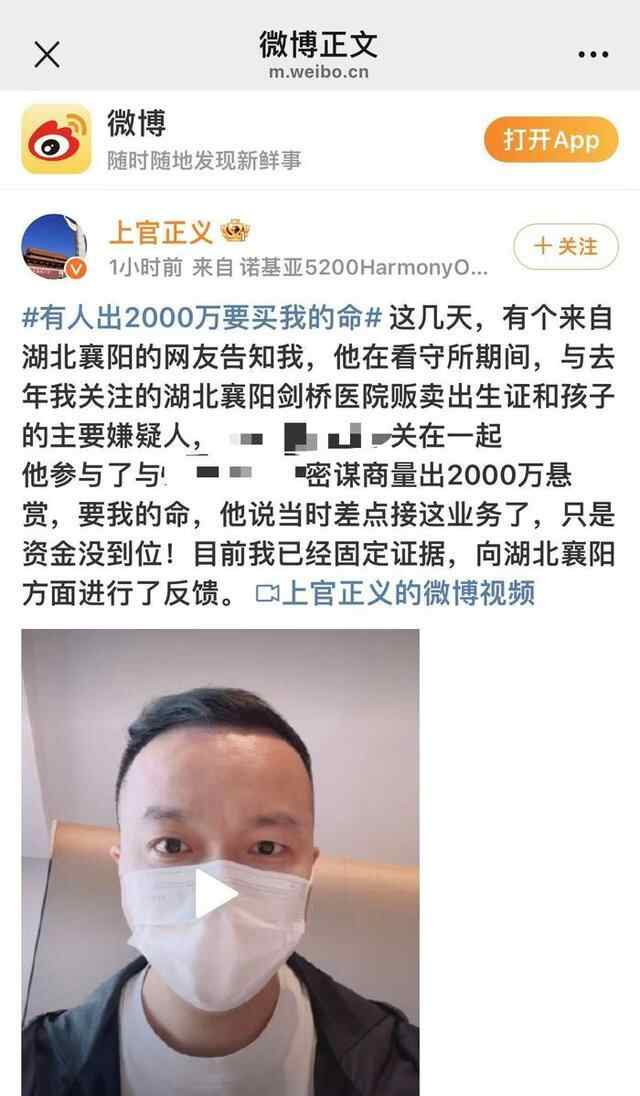 12月15日,打拐志愿者上官正义在社交平台发文称,自己遭到“千万悬赏买命”的威胁。他在视频中称,有一网友私信提醒他,湖北襄阳贩婴案嫌疑人叶某案件相关人员曾谋划筹资2000万元悬赏他的性命。