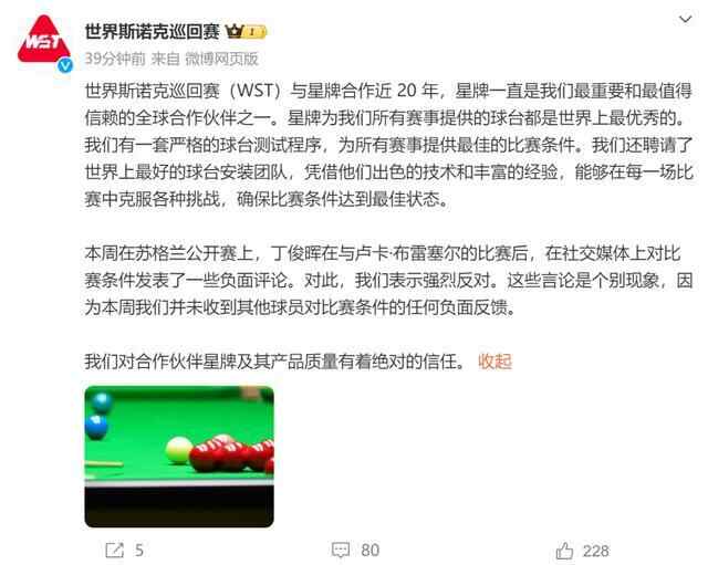 对此,12月15日,@世界斯诺克巡回赛 官方做出回应,其称,强烈反对丁俊晖的言论,并绝对信任球桌合作伙伴。