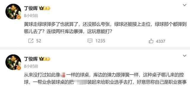 赛后,丁俊晖发文“炮轰”苏格兰公开赛,他表示,该赛事把业余球桌装起来给职业选手打,“从来没打过这样的球桌,弹力跟弹簧一样,这种桌子哪来的控球?”