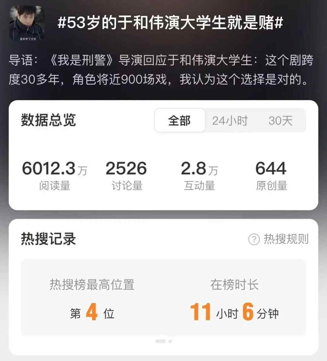 近日,电视剧《我是刑警》开播以来口碑持续发酵。12月15日,#53岁的于和伟演大学生就是赌#登上多个平台热搜。
