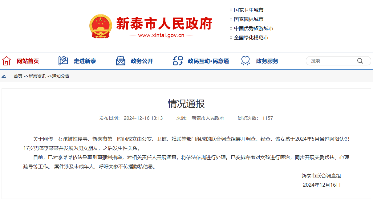 关于网传一女孩被性侵事,新泰市第一时间成立由公安、卫健、妇联等部门组成的联合调查组展开调查。经查,该女孩于2024年5月通过网络认识17岁男孩李某某并发展为男女朋友,之后发生性关系。