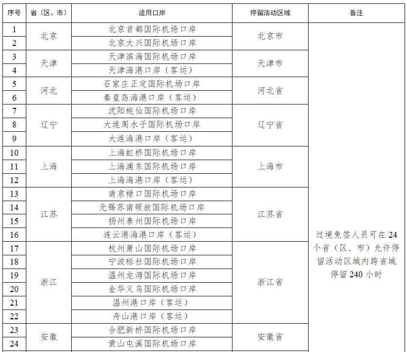 过境免签人员在安徽、海南、贵州3省停留活动区域为全省