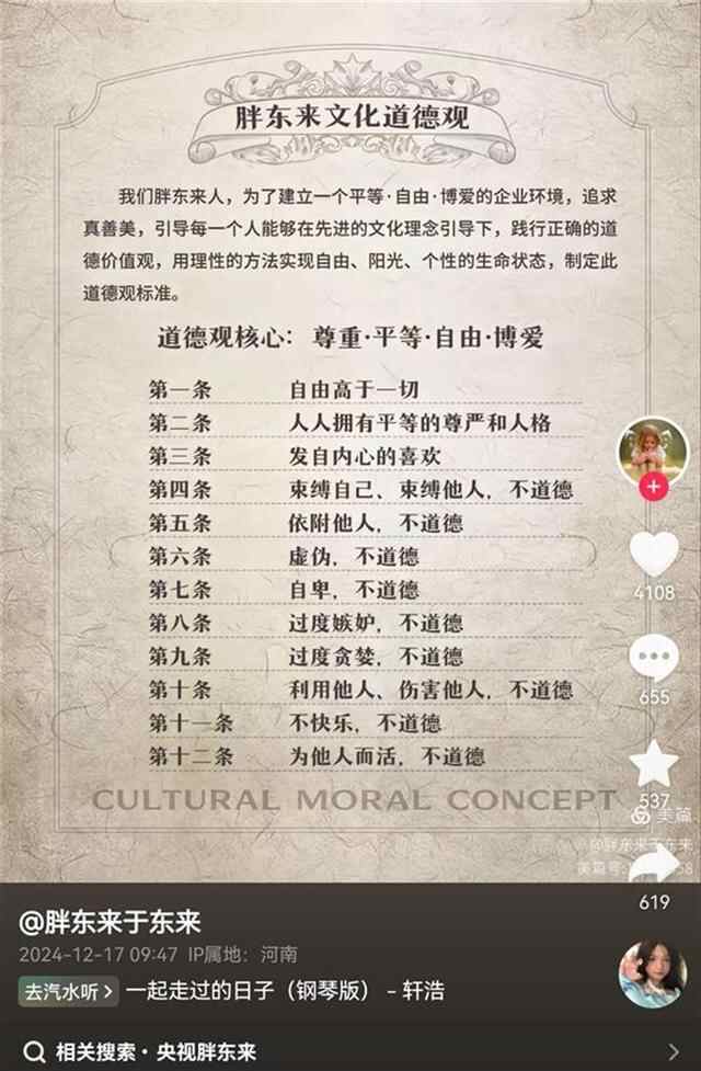 17日,他又在社交媒体上发布了胖东来的文化道德观:我们胖东来人,为了建立一个平等、自由、博爱的企业环境,追求真善美,引导每一个人在先进文化理念下,践行正确的道德价值观,用理性的方法实现自由、阳光、个性的生命状态!