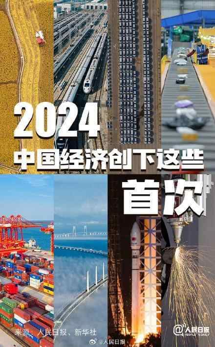 关键时期,关键一年,2024年中国经济实现多个新突破。粮食总产量首次突破1.4万亿斤;快递年业务量首次突破1500亿件;新能源汽车年产量首次突破1000万辆;铁路年度旅客发送量首次突破40亿人次;前三季度我国进出口总值历史同期首次突破32万亿元;港珠澳大桥正式开通以来年客流量首次突破2000万人次大关;首个商业航天发射场首次发射取得圆满成功;中国制造业企业总量首次突破600万家。