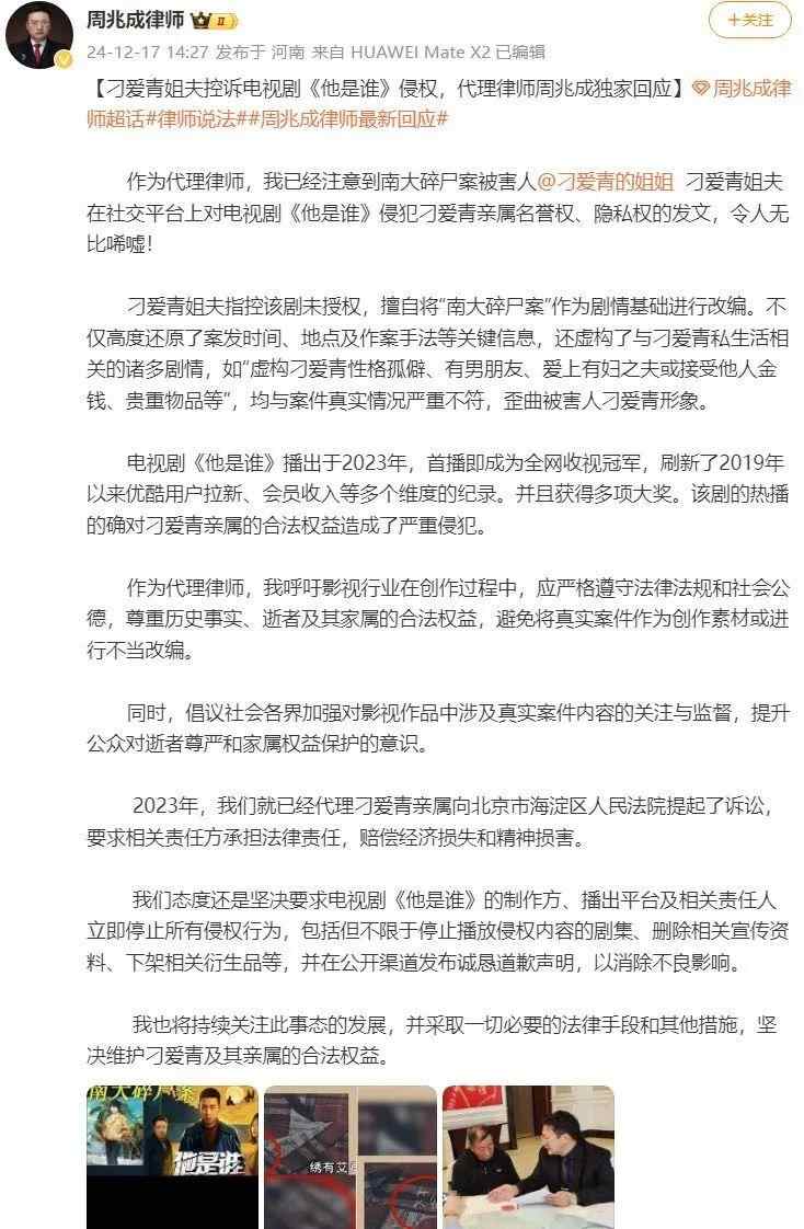 作为代理律师,我已经注意到南大碎尸案被害人@刁爱青的姐姐 刁爱青姐夫在社交平台上对电视剧《他是谁》侵犯刁爱青亲属名誉权、隐私权的发文,令人无比唏嘘!