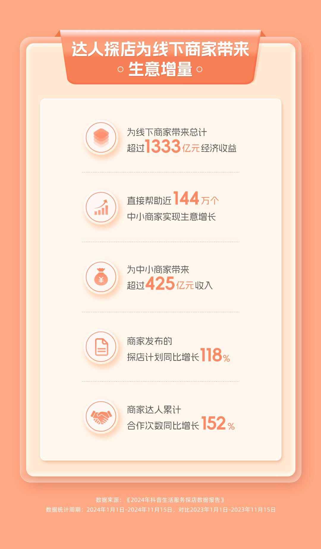 报告显示,2024年达人探店为线下商家带来超过1333亿元经济收益。其中,对中小商家生意的带动尤为明显,帮助近144万中小商家增收超过425亿元。