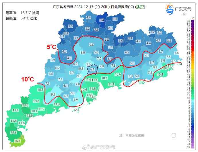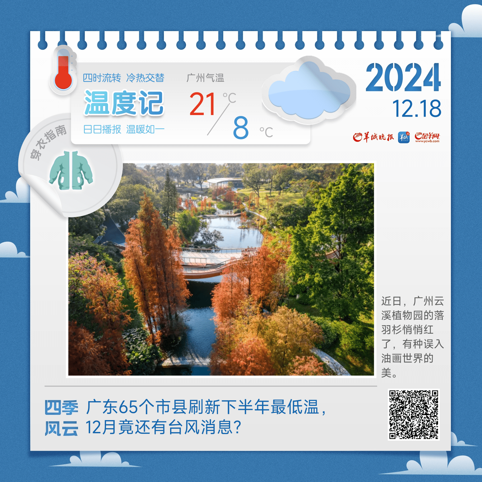 昨日(12月17日)早晨,由于晴空辐射降温明显,广东共有65个市县(超七成国家站)最低气温创今年下半年来新低,省会广州低至6.1℃,全省最低为仁化的0.4℃(12月15日仁化最低0.2℃)。