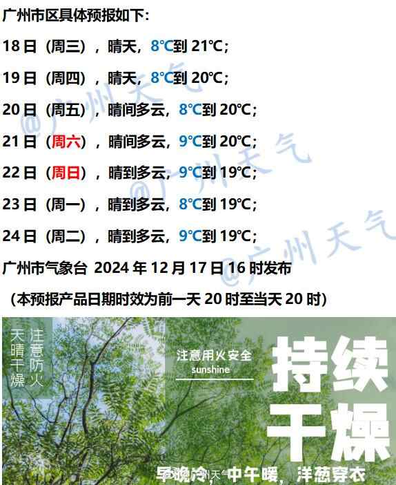 广州方面,受弱冷空气陆续补充影响,未来几天晴朗干燥天气维持,昼夜温差大,恍如过四季。