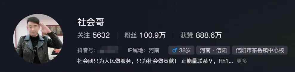 公开资料显示,“社会哥”名叫李成军,是河南息县的一名网红,目前相关平台粉丝已超百万。他在账号简介中写道:社会团只为人民做服务,只为社会做贡献。
